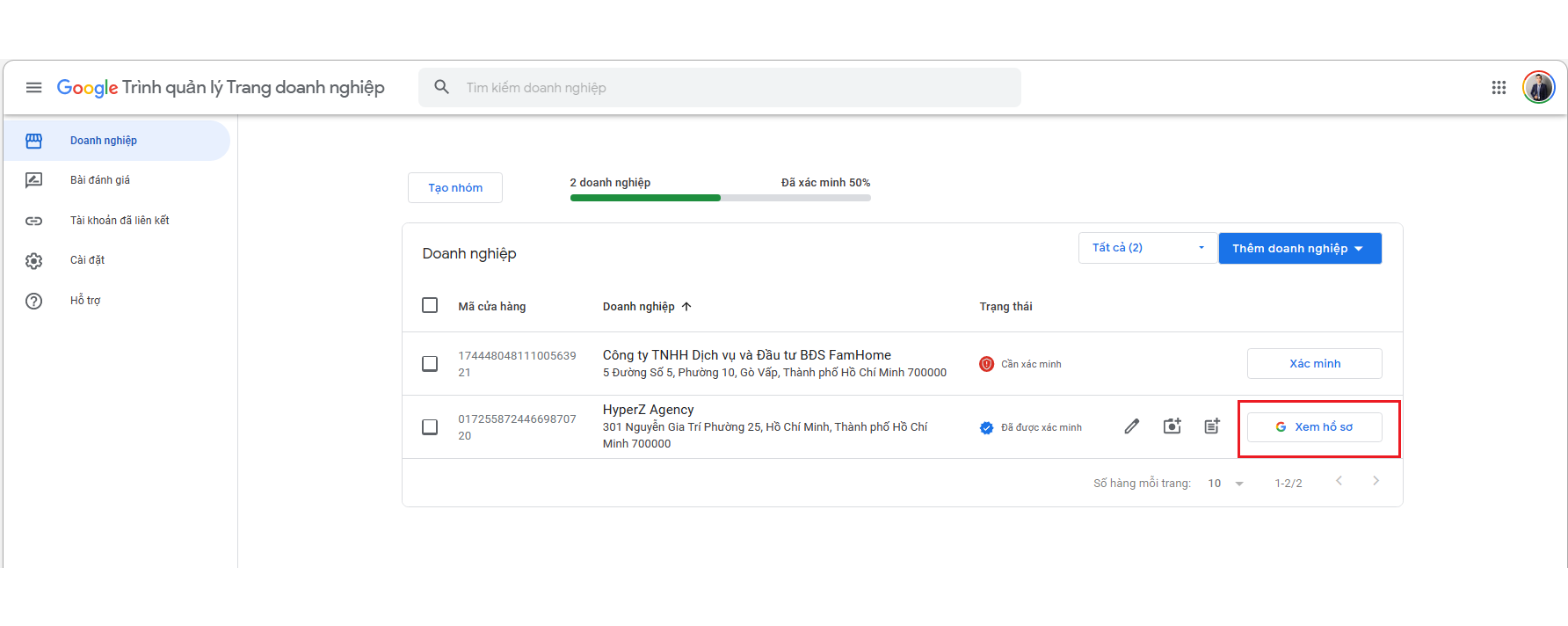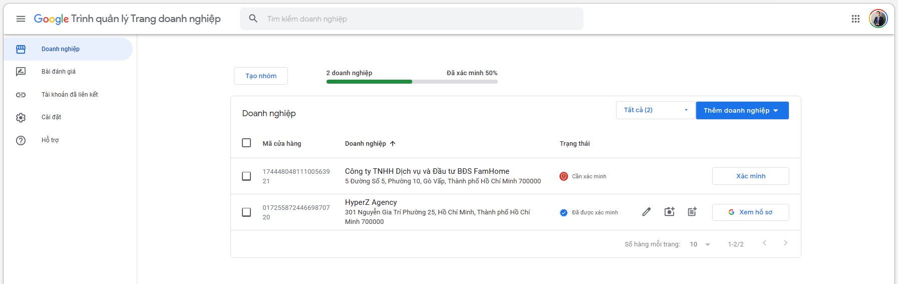Ví dụ như ở đây thì doanh nghiệp thứ hai là HyperZ Agency mình sẽ tạo được vì mình là chủ sở hữu doanh nghiệp và đã xác minh. Còn với doanh nghiệp đầu tiên thì mình không đủ điều kiện để làm gì hết, và tất nhiên là tạo QR Code cho địa điểm.