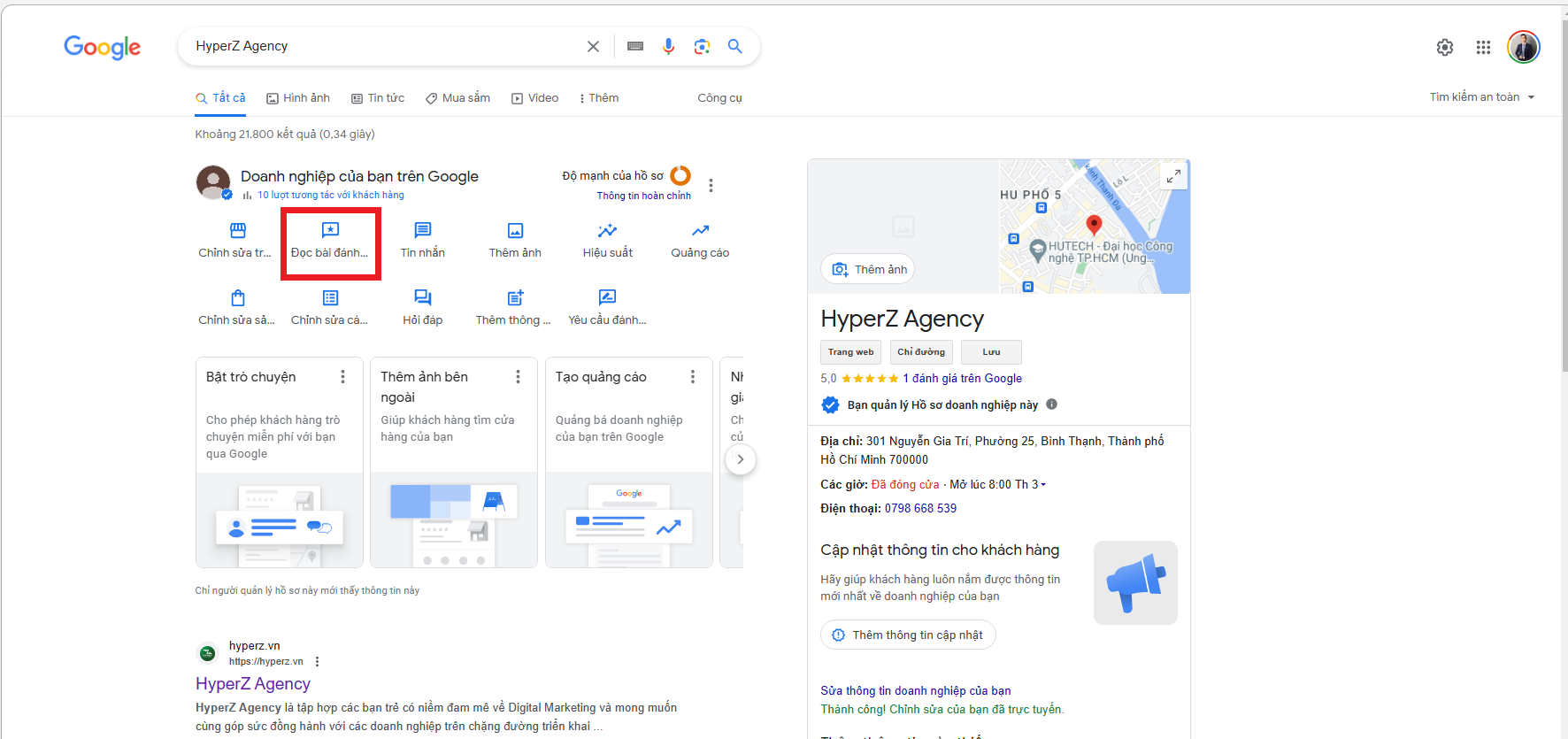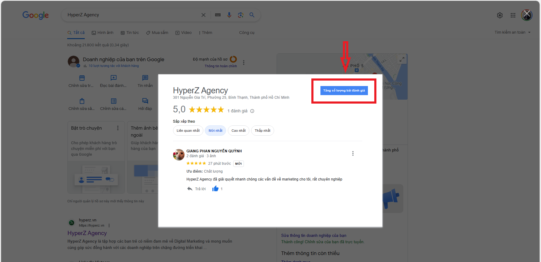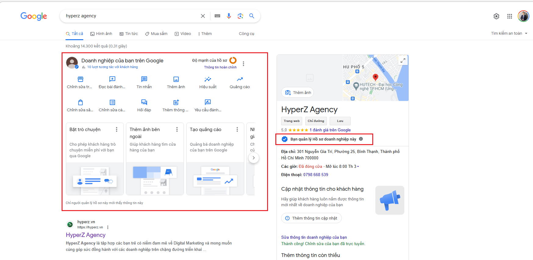 Hoặc để dễ kiểm tra hơn nếu bạn không muốn truy cập vào trình quản lý doanh nghiệp của Google thì có thể thao tác nhanh hơn bằng: Mở tab tìm kiếm mới trên Google ⇒ Nhập tên địa điểm (doanh nghiệp) của bạn ⇒ Và đã có tích xanh và xác nhận bạn là chủ sở hữu doanh nghiệp, có những thao tác quản lý địa điểm như hình bên dưới.