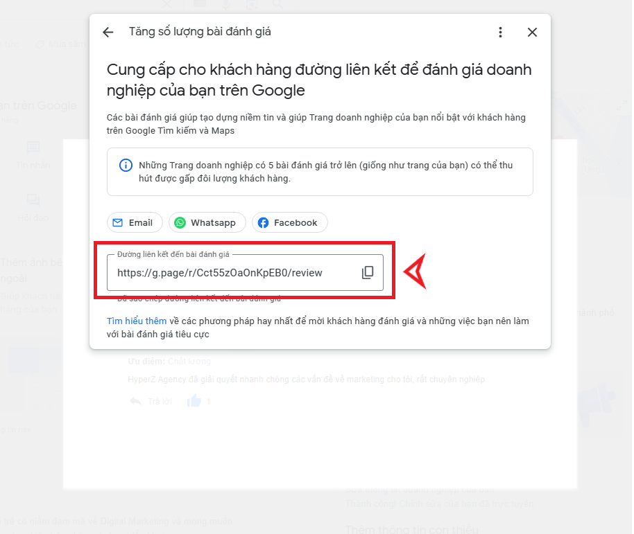 Bước 3: Ở đây vừa thể hiện toàn bộ đánh giá của khách hàng về địa điểm của bạn nhưng nó cũng có nút: “Tăng số lượng đánh giá” bạn chọn vào mục này