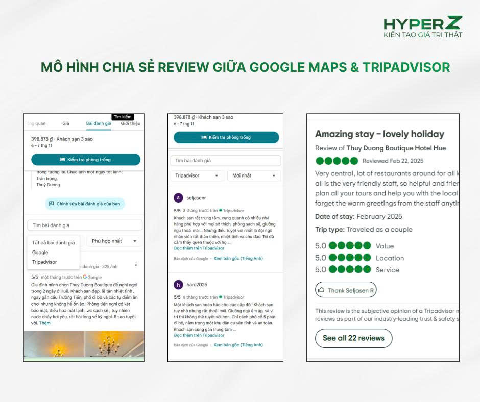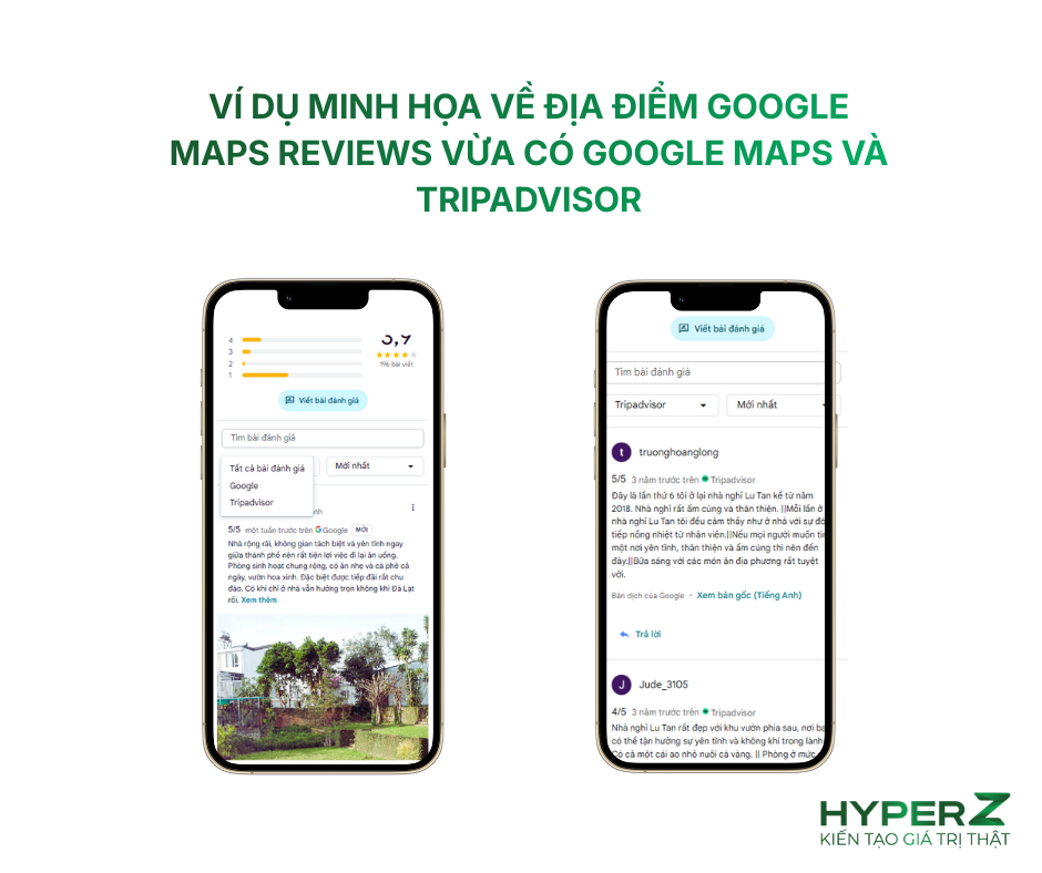 - Cung cấp thông tin toàn diện: Khách hàng có cái nhìn đa chiều hơn. Review của Google Maps thường tập trung vào tính tiện lợi và chi tiết thực tế, trong khi review của Tripadvisor lại đi sâu vào trải nghiệm du lịch.