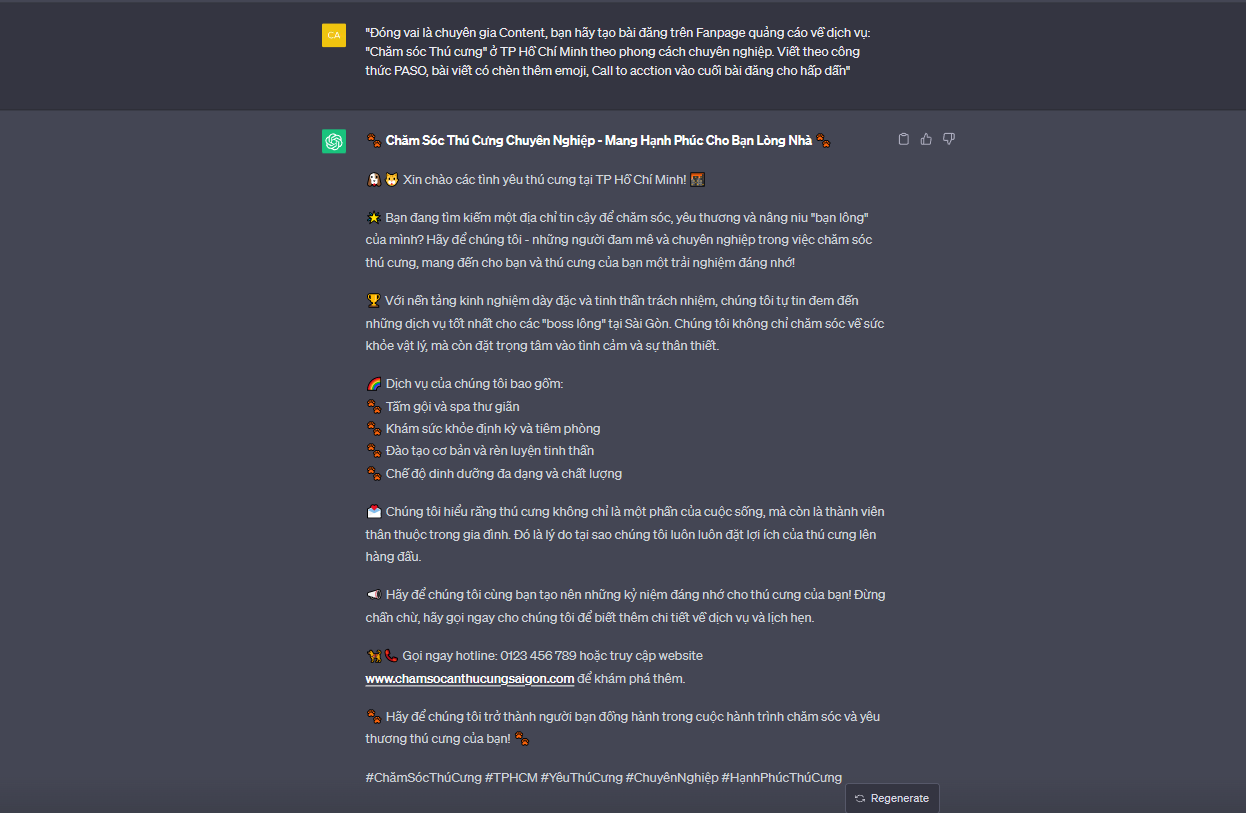 “Đóng vai là chuyên gia Content, bạn hãy tạo bài đăng trên Fanpage quảng cáo về dịch vụ: “Chăm sóc Thú cưng” ở TP Hồ Chí Minh theo phong cách chuyên nghiệp. Viết theo công thức PASO, bài viết có chèn thêm emoji, Call to acction vào cuối bài đăng cho hấp dẫn”