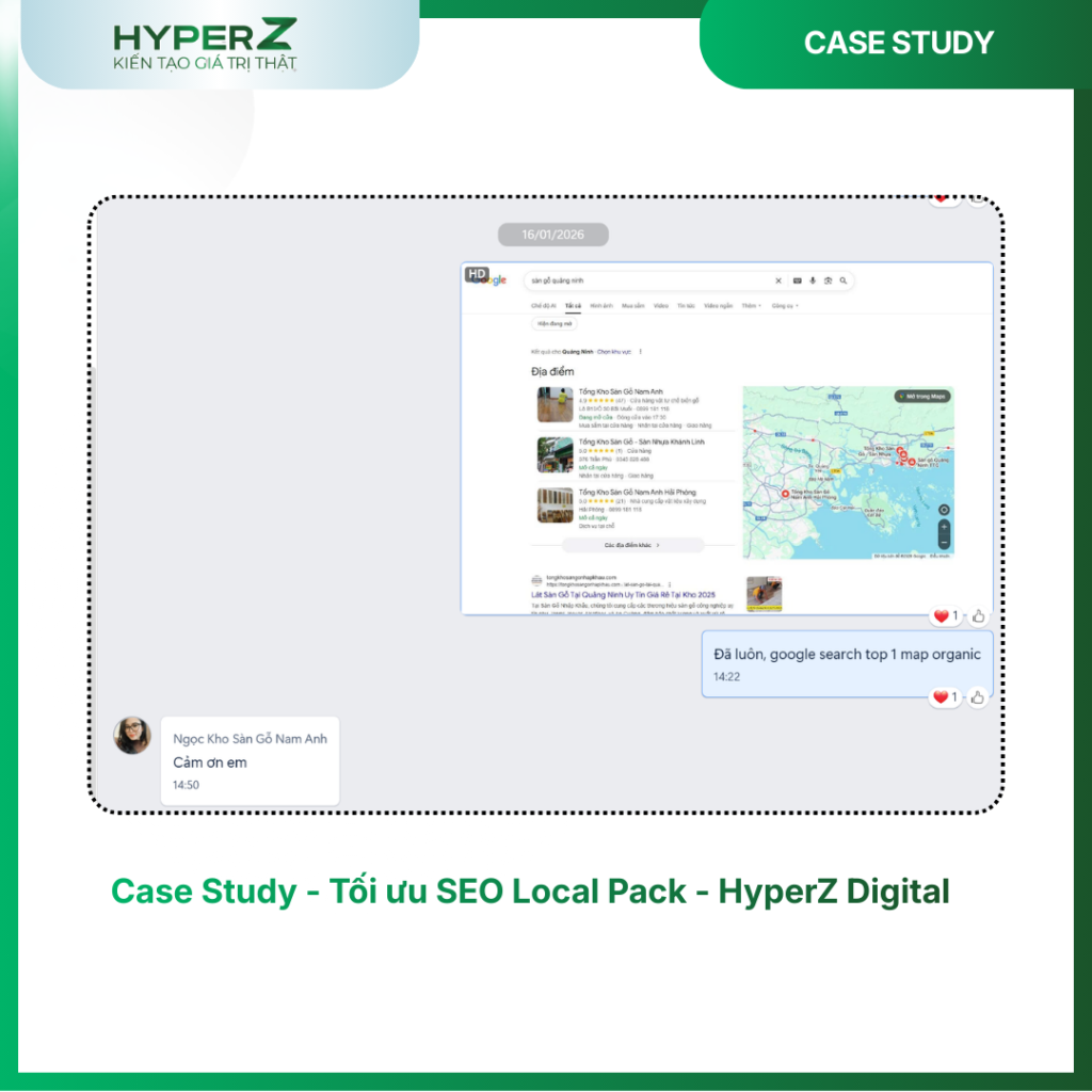 Ví dụ case study nâng thứ hạng SEO Local Pack Google từ HyperZ Digital