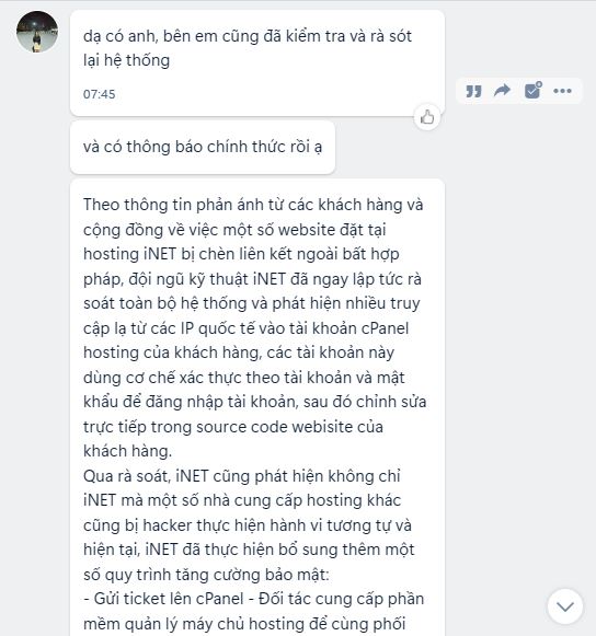 “Theo thông tin phản ánh từ các khách hàng và cộng đồng về việc một số website đặt tại hosting iNET bị chèn liên kết ngoài bất hợp pháp, đội ngũ kỹ thuật iNET đã ngay lập tức rà soát toàn bộ hệ thống và phát hiện nhiều truy cập lạ từ các IP quốc tế vào tài khoản cPanel hosting của khách hàng, các tài khoản này dùng cơ chế xác thực theo tài khoản và mật khẩu để đăng nhập tài khoản, sau đó chỉnh sửa trực tiếp trong source code webisite của khách hàng.