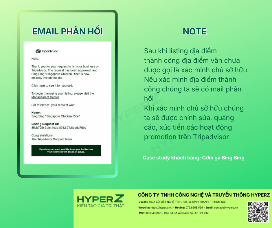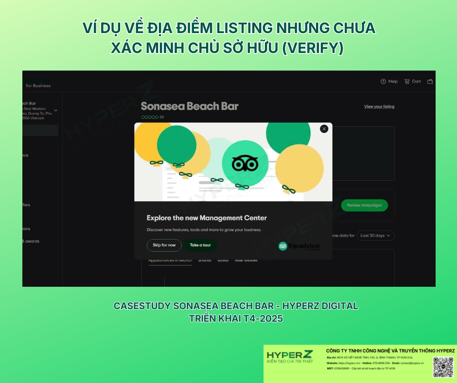 Nếu doanh nghiệp của bạn hoạt động trong lĩnh vực du lịch, khách sạn, hoặc F&B và đang muốn verify địa điểm trên Tripadvisor nhanh chóng, xử lý các lỗi thường gặp, hoặc xây dựng một chiến lược quản lý danh tiếng đa kênh hiệu quả, hãy để HyperZ Digital đồng hành cùng bạn. Với kinh nghiệm thực chiến đa nền tảng và cam kết mang lại kết quả đo đếm được, HyperZ Digital sẽ giúp bạn từ việc xác minh hồ sơ đến việc tối ưu hóa nội dung, đảm bảo sự hiện diện trực tuyến của bạn là mạnh mẽ và nhất quán. Hãy tin tưởng lựa chọn HyperZ Digital để triển khai và giám sát các công việc Digital Marketing, giúp doanh nghiệp bạn bứt phá và tiết kiệm tối đa thời gian, ngân sách, và con người.