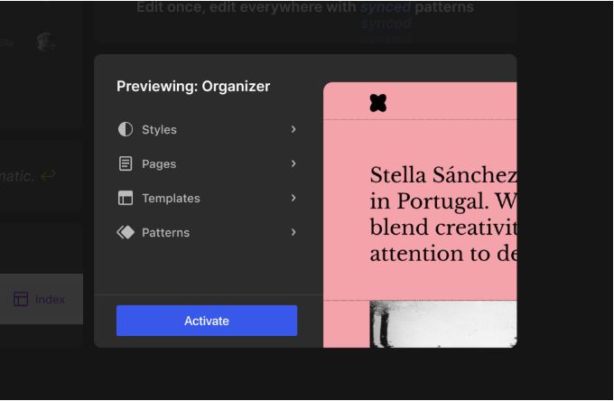 Trải nghiệm các chủ đề khối trước khi bạn chuyển đổi và xem trước Trình chỉnh sửa trang, với các tùy chọn để tùy chỉnh trực tiếp trước khi chuyển sang một chủ đề mới.