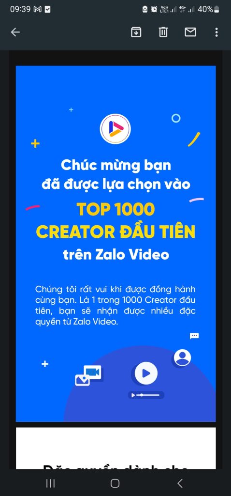 Thành công: Kênh của bạn đã lọt top 1.000 creator đầu tiên, hãy chờ đợi email từ Zalo Video nhé