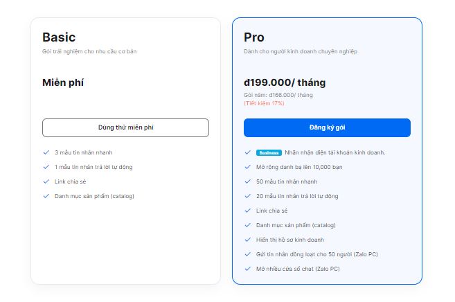 4. Bảng giá của Zalo ZBusiness: