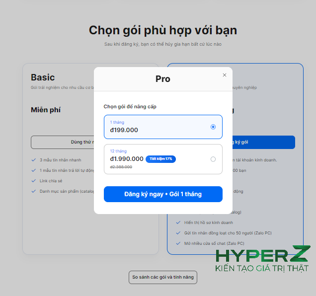 Kéo xuống phần chọn gói và tiến hành đặt mua gói. Nếu bạn chọn gói 12 tháng sẽ tiết kiệm hơn gói 1 tháng. Sau đó đăng nhập vào tài khoản Zalo thông qua QR Code và thanh toán là xong.