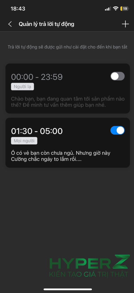 Với tin nhắn tự động, bạn có thể trả lời khách hàng ngay cả khi vắng mặt bằng mẫu tin soạn sẵn. Ngoài ra, bạn còn có thể giảm thời gian soạn tin nhắn (nội dung lặp đi lặp lại) với mẫu tin nhắn nhanh.