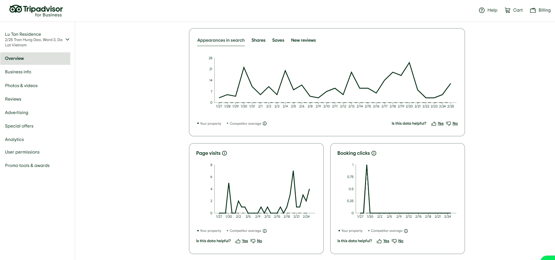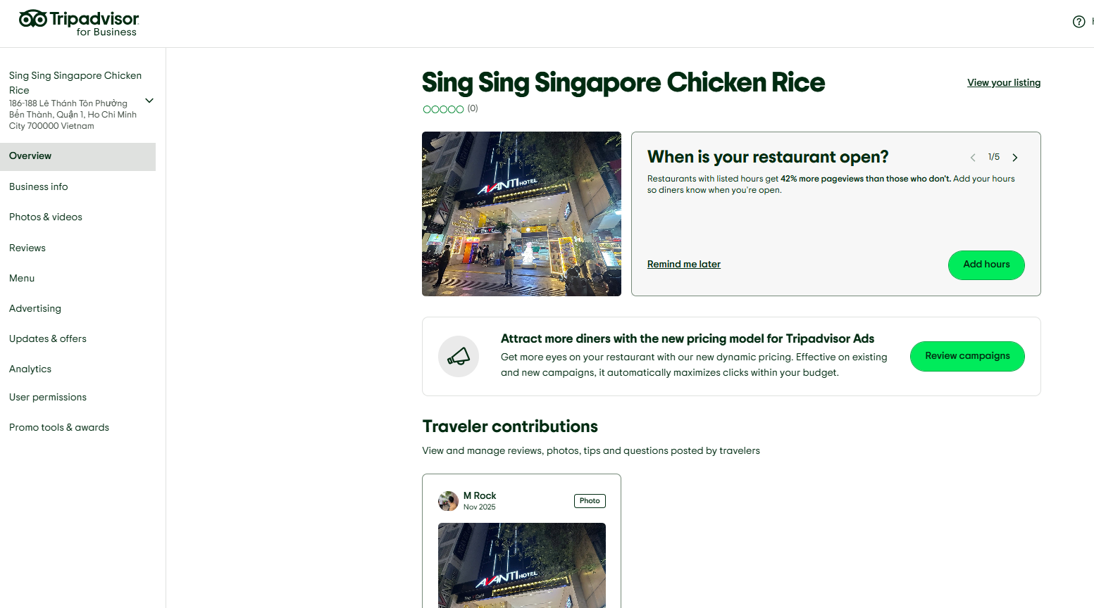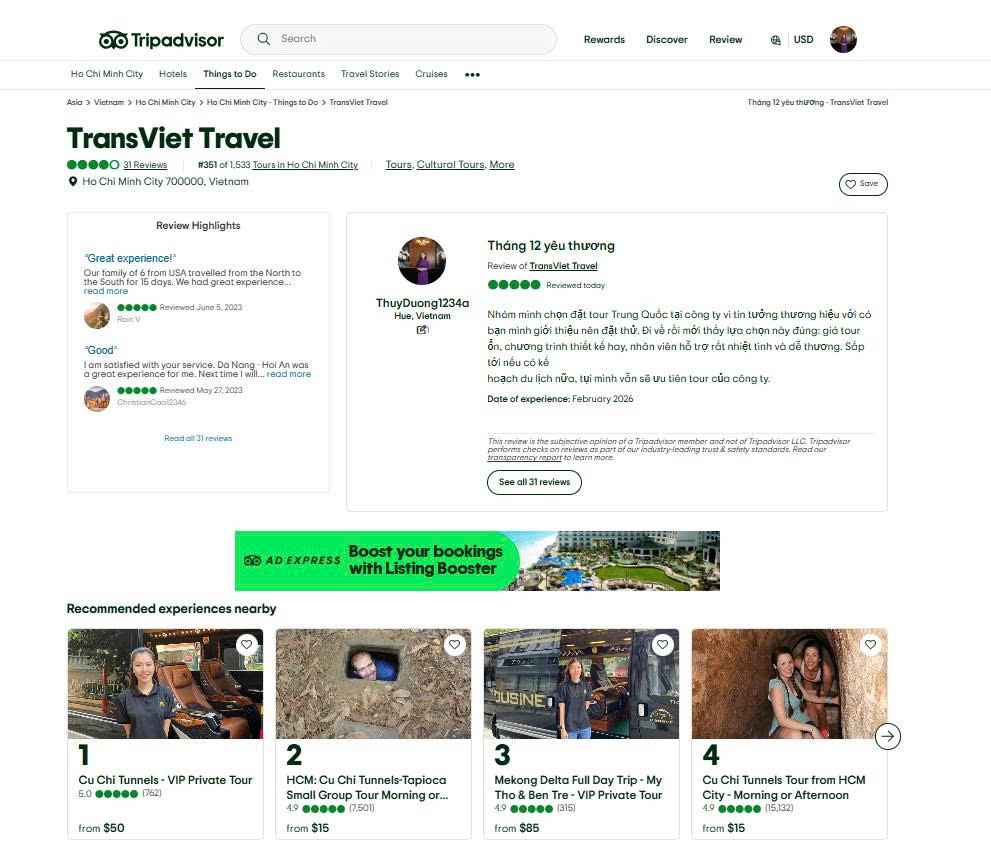 Quản lý quảng cáo: Thiết lập và tối ưu ngân sách cho Tripadvisor Ads để đẩy hồ sơ lên top tìm kiếm tại địa phương.